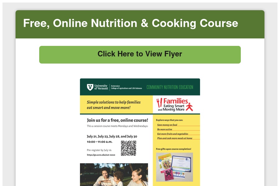 Free, Online Nutrition & Cooking Course Click Here to View Flyer Pre-registration is Required by July 16, 2025 UVM Extensions Community Nutrition E. . .